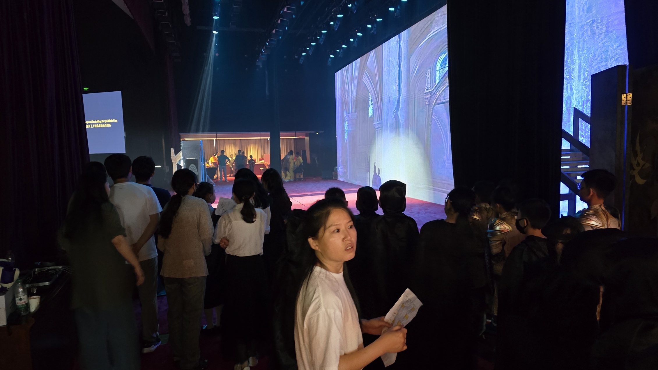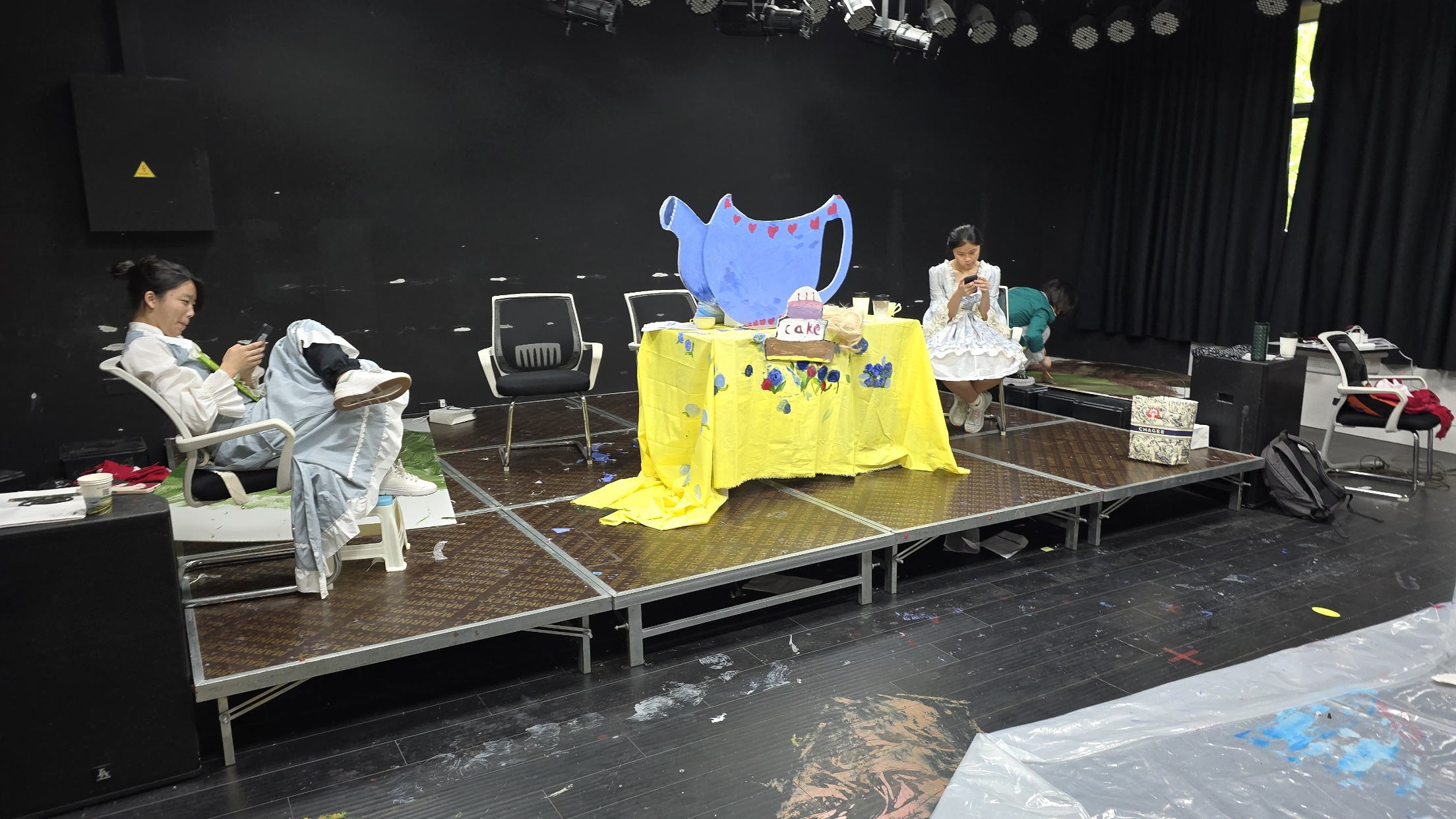 We only had a ten-minute slot, and the four weeks before the production were exam weeks, so we were severely limited in what we could do. However, we pulled it off! We created most of our own scenery and even had two set changes on a stage designed for presentations rather than plays.
